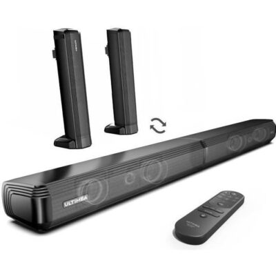 Ultimea Barre de son 2.2 canaux, Double caisson de basses intégré, Basses Profondes, Séparable 2 en 1, Arc / Optique / Aux