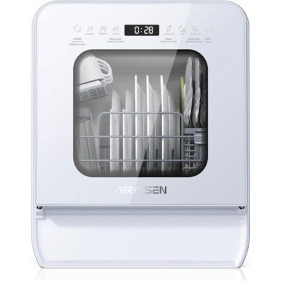 Mini Lave-Vaisselle AIRMSEN Compact 37cm, 4 Couverts, 9 Programmes, Sans Installation, Nettoyage Auto, Départ 24H, 5L Réservoir