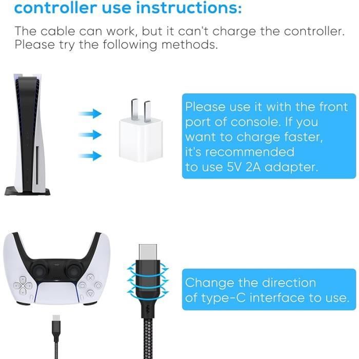 (Note importante–1Veuillez utiliser le port usb avant pour PS5 console afin dobtenir la charge la plus rapide, le port usb arrière entraînera une vitesse de charge très lente. 2Veuillez utiliser ladaptateur dalimentation 5V2A ci-dessus.) COLLIER ANTI-FUGUE