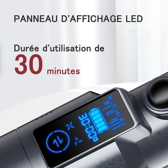 Autres caractéristiques Cet aspirateur à main est doté d’un écran d’affichage LED interactif intelligent. Analysez avec précision le temps d’utilisation restant avec différents niveaux et différentes puissances d’aspiration. L’écran d’affichage numérique LED clair simplifie et rend l’utilisation plus intelligente.