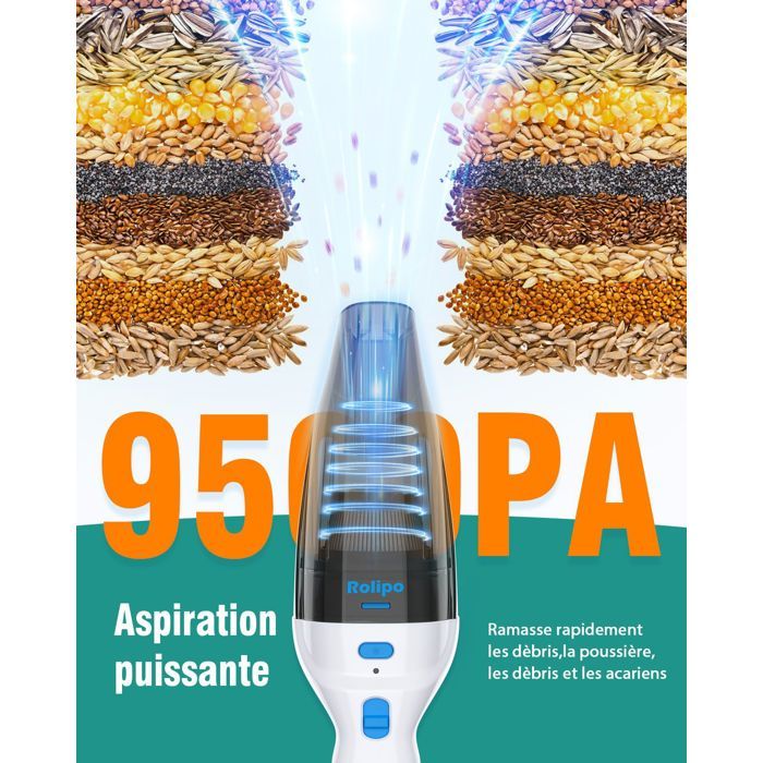 【9500Pa Forte Aspiration】Cet mini aspirateur sans fil amélioré offre jusqu’à 9500Pa d’aspiration cyclonique. Aspirateur a main parfait pour éliminer poussière, miettes et poils d’animaux sur voitures, canapés, murs, escaliers et zones difficiles d’accès.