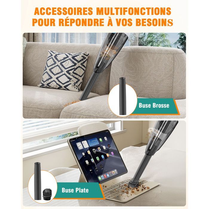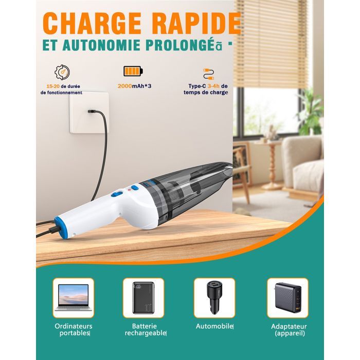 | Collecte des poussières | Aspirateur à main sans fil nettoie de manière professionnelle les sièges de voiture, les tapis, les poils d’animaux et les recoins cachés |