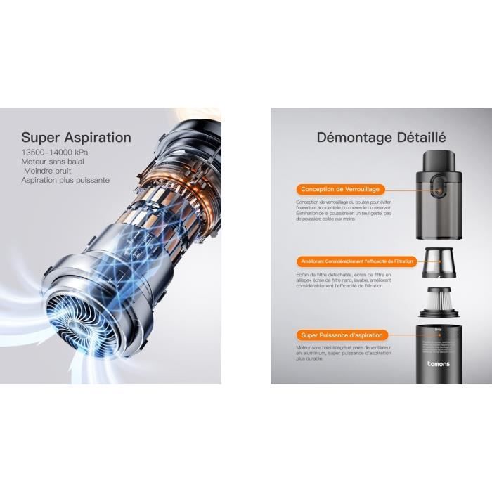 | Nom du produit | Aspirateur à main – TOMONS – 14000PA – Filtre HEPA – Sans sac – Rechargeable |