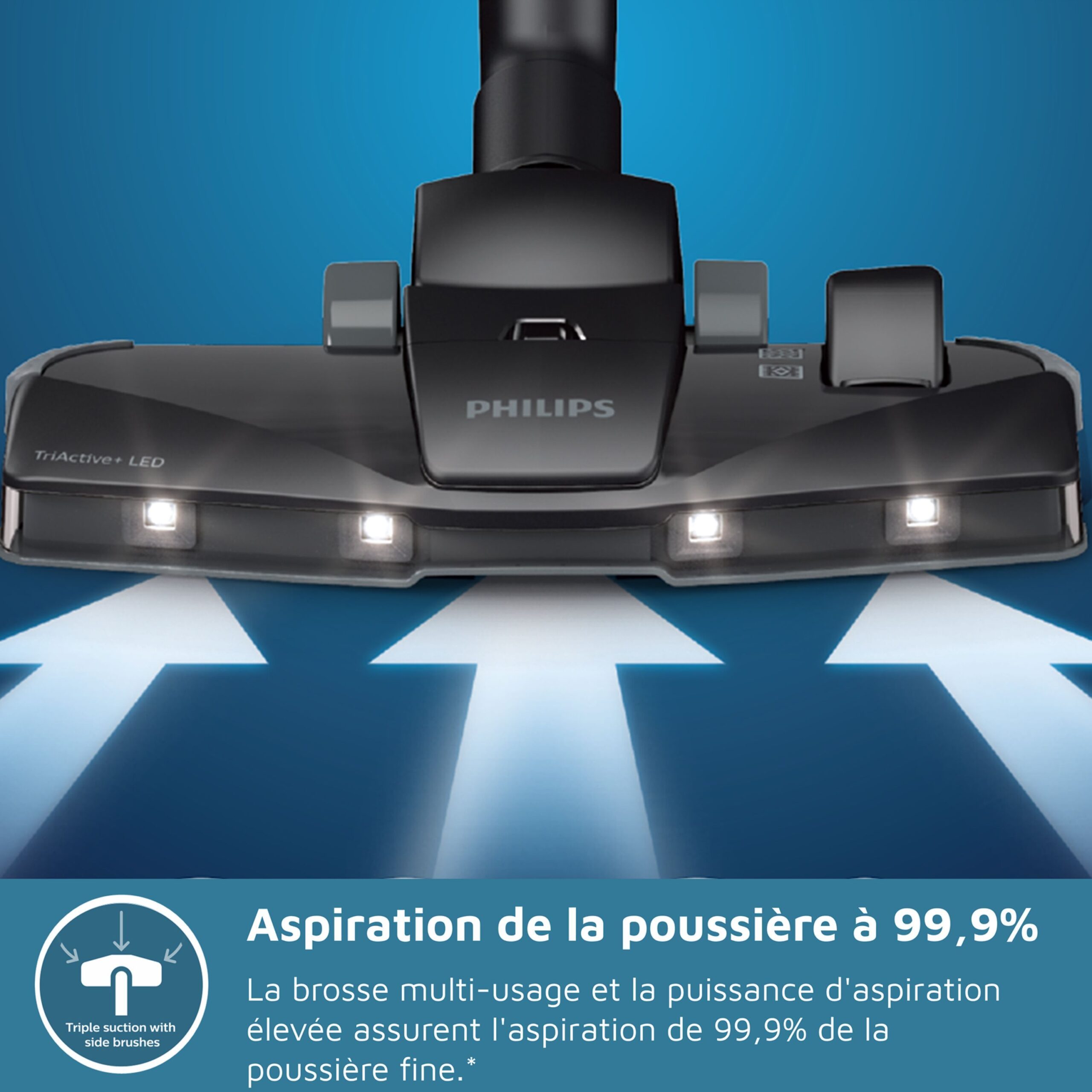 L’aspirateur Philips de la Série 6000 redéfinit les standards du nettoyage domestique grâce à sa brosse TriActive+ avec LED intégrée. Cette technologie exclusive éclaire la poussière invisible à l’œil nu, révélant les zones à traiter pour un nettoyage vraiment impeccable. Son moteur de 900 W fournit une aspiration puissante, tandis que la technologie AirflowMax maintient une performance optimale jusqu’au remplissage complet du sac. Conçu pour les utilisateurs exigeants, cet aspirateur avec sac offre un grand confort d’utilisation : tube télescopique en métal, roues caoutchouc, protections souples pour les meubles, variateur de puissance et rayon d’action de 9 mètres. Avec un niveau sonore contenu à 77 dB et une capacité généreuse de 4 litres, il s’impose comme un outil fiable et performant au quotidien. Cet aspirateur avec sac Série 6000 est équipé d’un filtre HEPA ultra-performant capable de capturer plus de 99,99 % des allergènes, poussières fines, pollens et poils d’animaux. Ce niveau de filtration, certifié ECARF, en fait un véritable aspirateur avec filtre hepa, idéal pour les personnes allergiques ou sensibles à la qualité de l’air intérieur. Parfaitement équipé, cet aspirateur traineau inclut une brosse douce intégrée, un suceur plat et un accessoire spécial pour tissus d’ameublement. Son design moderne, ses sacs S-bag longue durée et ses 4 sacs inclus en font un appareil complet et durable, pensé pour un entretien intensif et soigné de votre intérieur.