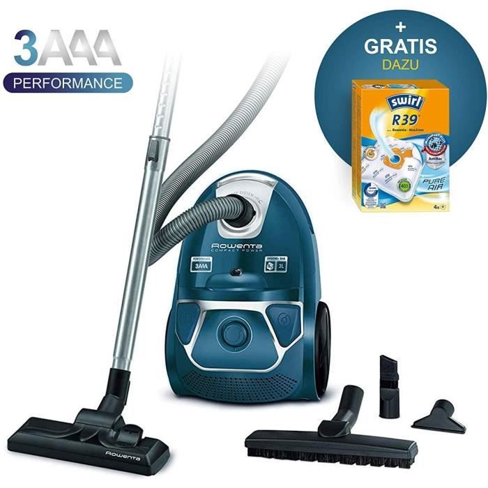 Aspirateur Rowenta RO3950 ultra silencieux de 750 W, équivalent à 2000 W. Inclus : 4 sacs d’aspirateur compatibles et un filtre anti-allergène MicroPor Plus pour une filtration optimale des poussières fines. Idéal pour un nettoyage sec et efficace, avec un embout spécialement conçu pour les parquets.