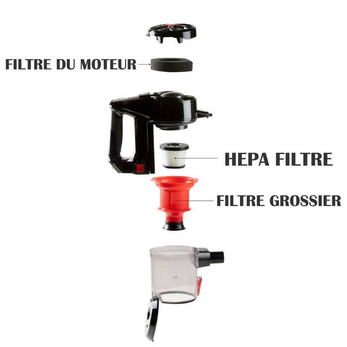 - Le filtre HEPA 13 élimine 99,95 % des particules de poussière dans l’air sortant.