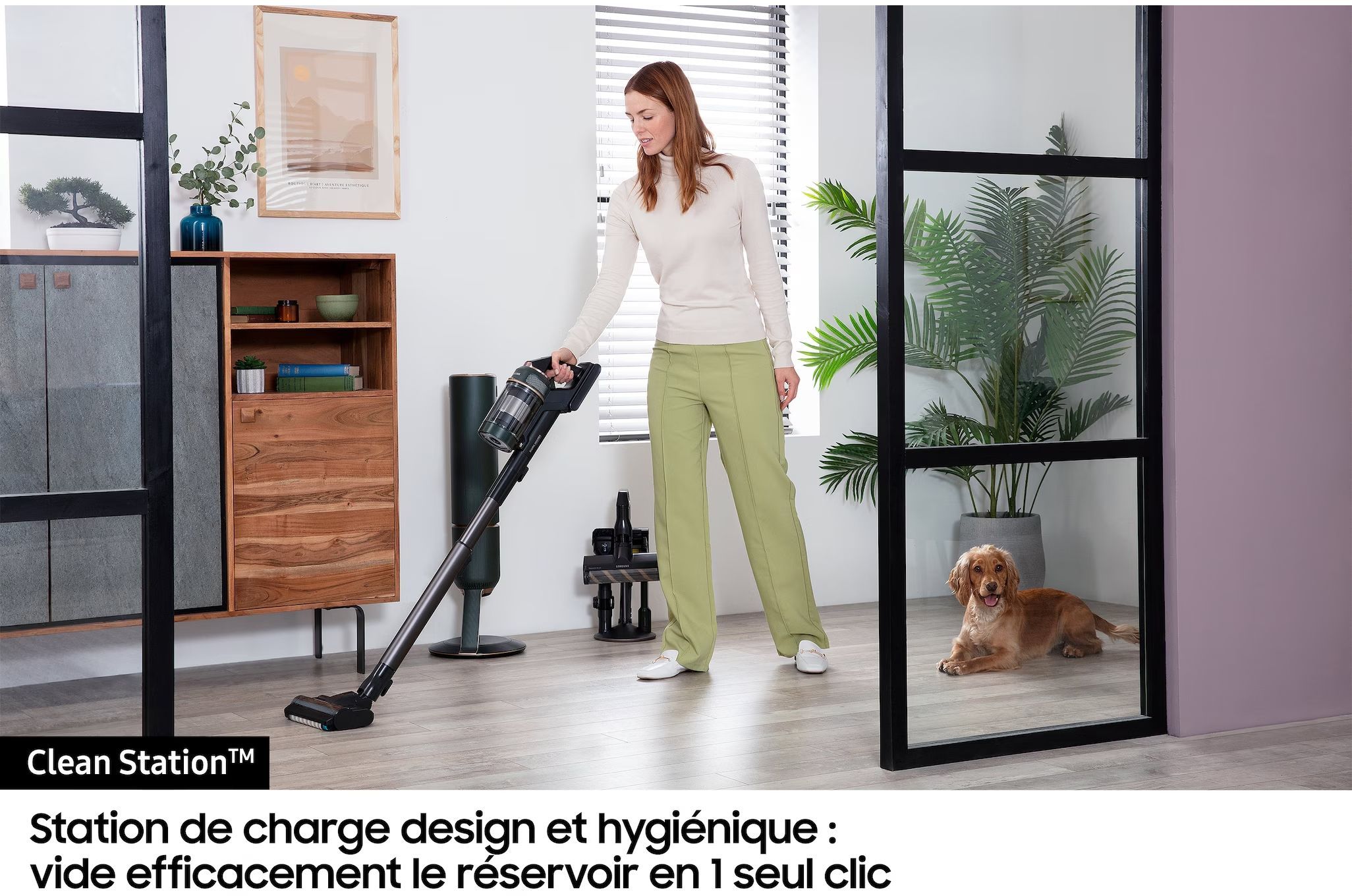 Découvrez l’aspirateur balai Samsung BESPOKE AI Jet lite pet (réf. VS80F28ELP), l’alliance parfaite entre puissance, technologie et hygiène. Doté d’une puissance d’aspiration impressionnante de 280 AW et d’une autonomie allant jusqu’à 60 minutes, il est idéal pour un nettoyage complet de votre intérieur. Grâce à son moteur Digital Inverter et son système multicyclonique Jet Cyclone, il capture efficacement les particules fines. Sa brosse Jet Dual+ s’adapte à tous les types de sols et évite les emmêlements, tandis que la mini-brosse Pet Tool+ élimine facilement les poils d’animaux. La Clean Station 2.0 assure une vidange hygiénique du réservoir et un air plus pur grâce à la filtration HEPA. Connecté via Wi-Fi, il vous permet de suivre et personnaliser vos nettoyages via l’application SmartThings. Certifié par la British Allergy Foundation, il garantit un environnement sain. Son design élégant gris galet et son écran LCD multilingue complètent ce concentré d’innovations. Offrez-vous une expérience de nettoyage intelligente, performante et hygiénique avec le BESPOKE AI Jet lite pet.