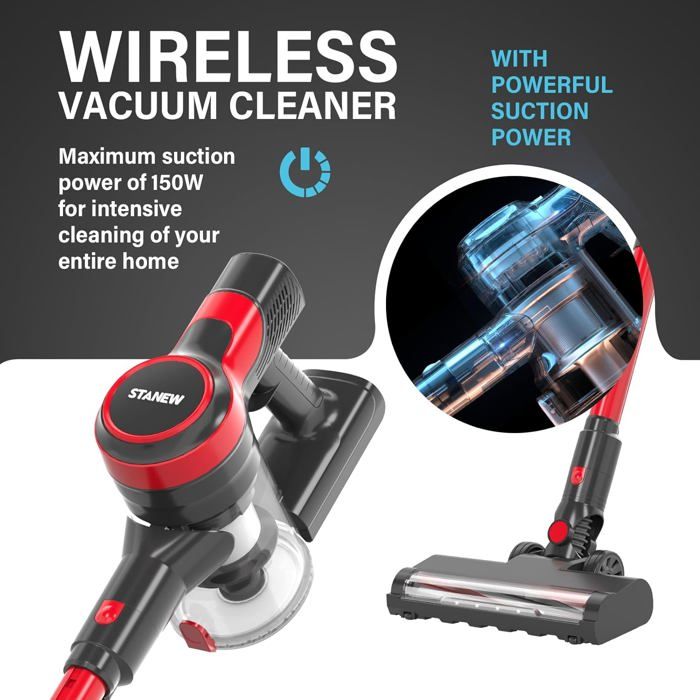Aspirateur balai sans fil STANEW, lger (2.8kg) et maniable, avec un systme de filtration HEPA qui retient 99,99 des particules. Autonomie de 40 minutes, 2 vitesses d’aspiration, et capacit du bac poussires de 0.8L. Idal pour un nettoyage efficace et pratique, se range facilement sur un support mural.