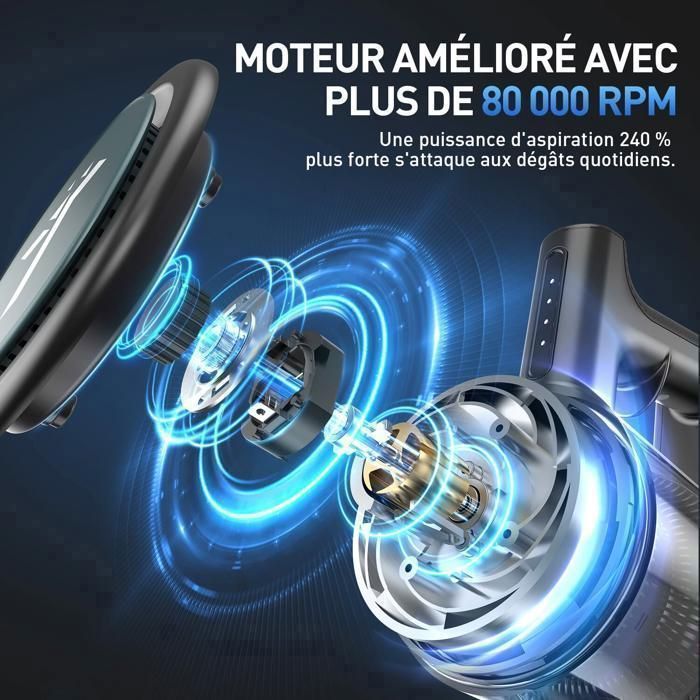 80 000 tours/minute pour une aspiration puissante et constante.