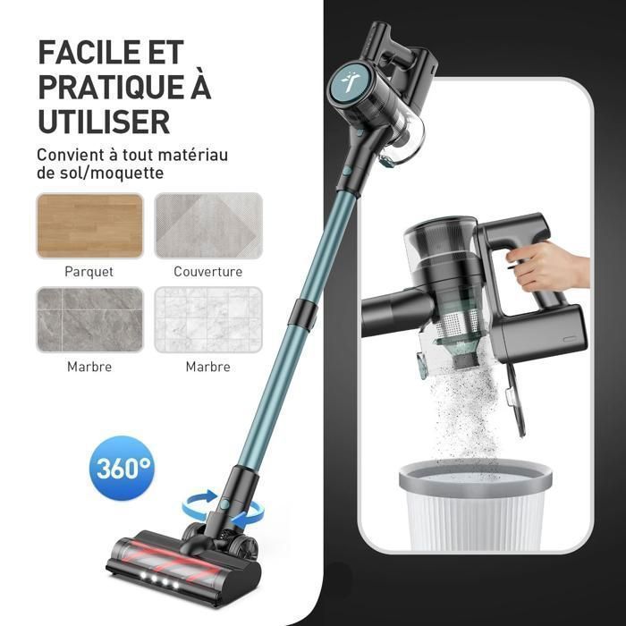 Teendow – Aspirateur Balai Sans Fil – 58Kpa – Autonomie 45 min MAX – Batterie Amovible – Compte à rebours d’autonomie affiché – Moteur sans balais à haut rendement
