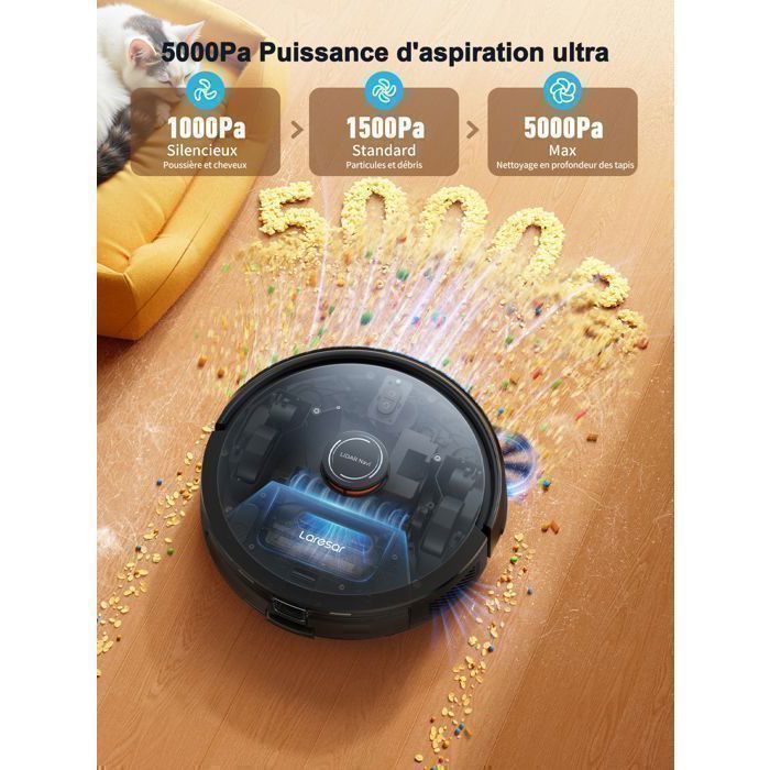Grâce à son moteur haute performance, profitez de trois niveaux de puissance d’aspiration, allant jusqu’à 5000 Pa. Élimine efficacement poussière, débris, cheveux, céréales et autres déchets secs pour un nettoyage en profondeur.