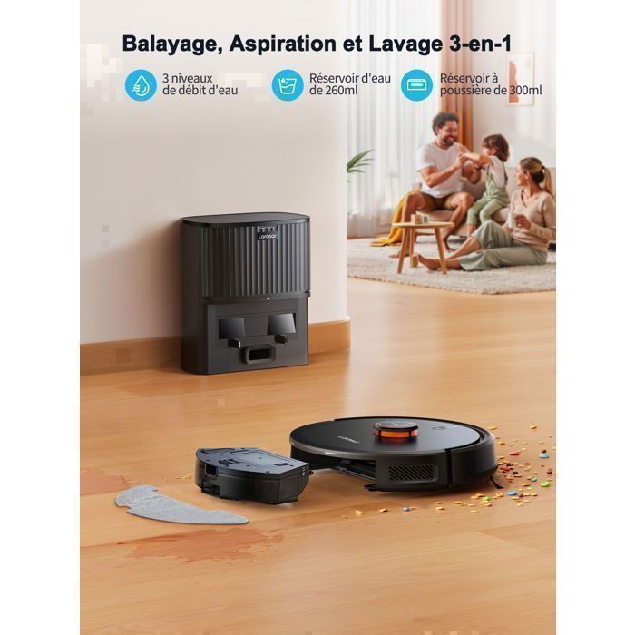 Robot Aspirateur et serpillière, solution de nettoyage 3 en 1 avec contrôle de l’eau Spécial Poils d’Animaux |