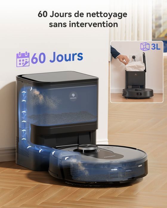 Oubliez l’aspiration pendant des mois grâce à la station d’auto-vidage qui permet au Q8 Max de se vider tout seul pendant jusqu’à 60 jours. (Sac à poussière de 3L; la fréquence de vidange peut varier en fonction des habitudes d’utilisation et de l’environnement domestique.)