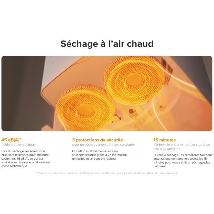 Station multifonction : lavage automatique des serpillières, séchage à l’air chaud, vidage automatique de la poussière, remplissage automatique du réservoir, Base détachable, rechargement plus rapide de 30%.