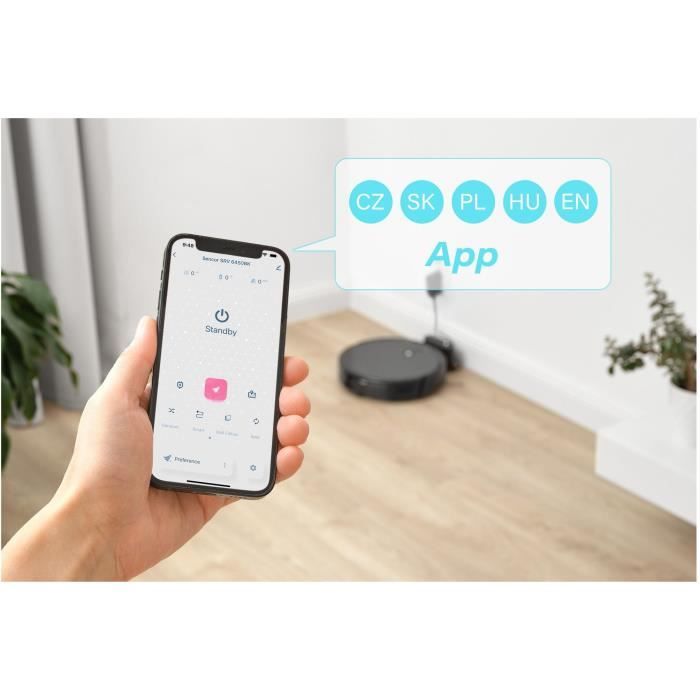 L’aspirateur robot Sencor SRV 6450BK s’adapte facilement à tous les types de sols et peut aspirer et passer la serpillière en même temps. Sa taille compacte de 32 cm de diamètre et 7,5 cm de hauteur garantit un nettoyage confortable, un déplacement aisé entre les obstacles, même dans les petits espaces et sous les meubles. Vous pouvez compter sur une puissance d’aspiration élevée de 3 000Pa et une autonomie de 140 minutes. Pour le contrôler, utilisez la télécommande ou l’application mobile Sencor Home. Cette dernière permet un contrôle et des réglages constants, même en dehors de votre domicile. Une grande brosse rotative assure une propreté parfaite. Les brosses latérales sont chargées de nettoyer en profondeur chaque recoin. La navigation gyroscopique se charge d’un déplacement efficace et sûr dans toute la maison.