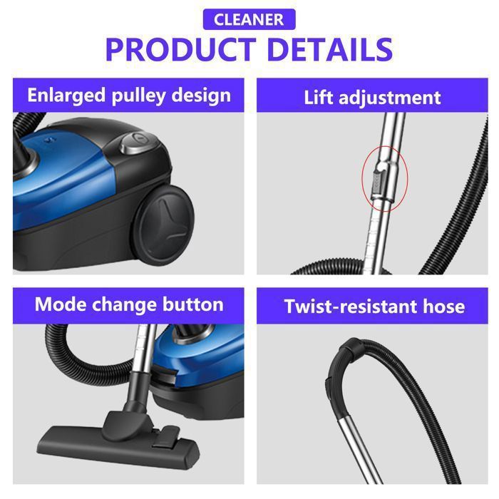 Cet aspirateur sans sac de 2000 W offre une aspiration puissante qui élimine facilement la poussière, les cheveux et les débris alimentaires. Son filtre HEPA retient 99,97 % des substances nocives et sa conception hypoallergénique protège la santé de votre famille. Il est fourni avec une rallonge de 4,5 mètres, une perche télescopique de 44 à 70 cm et plusieurs buses pour un nettoyage complet. Doté d’une prise européenne, il est livré avec deux unités principales, deux buses et un ensemble complet d’accessoires prêts à l’emploi.