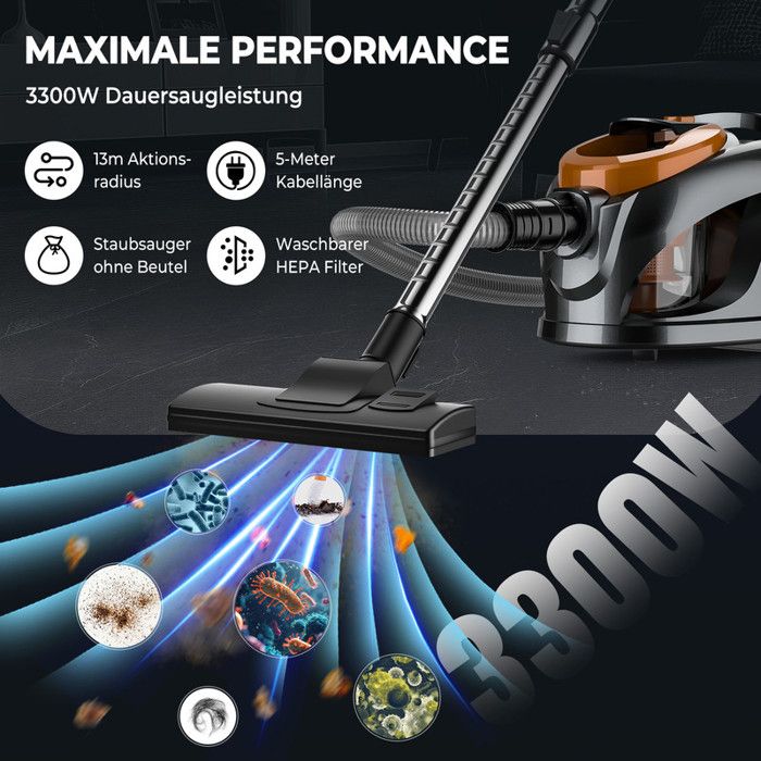 Aspirateur Sans Sac Puissant 3300W Silencieux Avec Filtre HEPA Lavable, Grande Capacité 3L, Tube Télescopique, Câble 5M, Nettoyage Sols Moquettes Poils D’animaux Maison