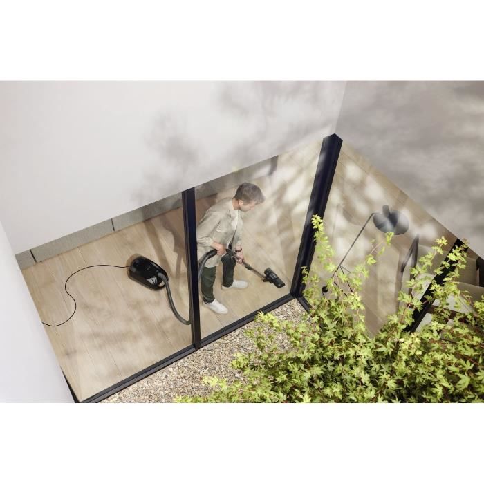 Réglage électronique de la puissance d’aspiration Sélecteur rotatif à quatre niveaux. Tube d’aspiration : Tube télescopique EasySlide. Système Parking pour les pauses. |
