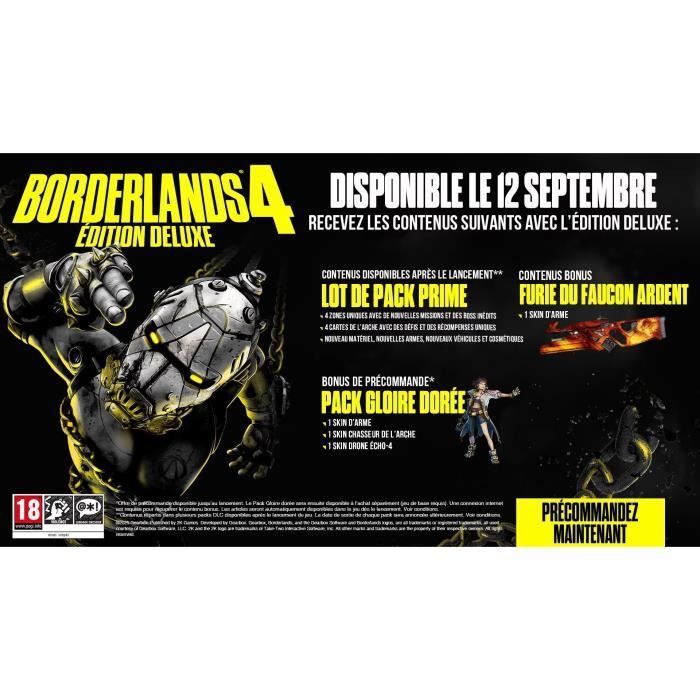 | Modalités Bonus de précommande | Précommandez Borderlands 4 et recevez le « Pack Gloire dorée » contenant un Skin Chasseur de l’Arche, un Skin d’arme et un Skin Drone ÉCHO-4 ! Ce bonus ne s’applique que sur l’offre vendue par Cdiscount et non sur les offres MarketPlace. |