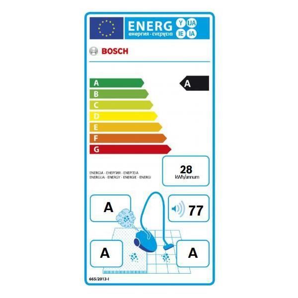 Etiquette énergie• Efficacité énergétique : A• Consommation annuelle d’énergie : 28 kWh• Qualité de filtration : A• Efficacité d’aspiration sur moquette : A• Efficacité d’aspiration sur sols durs : A• Niveau sonore : 77 dB Hygiène• Filtre HEPA 13 lavable Confort d’utilisation• Capacité du sac : 4 L• Rayon d’action : 10 m• Brosse universelle double position• Brosse sols durs• Variateur électronique de puissance