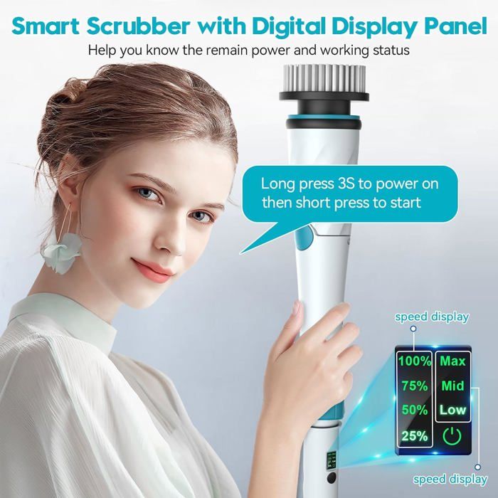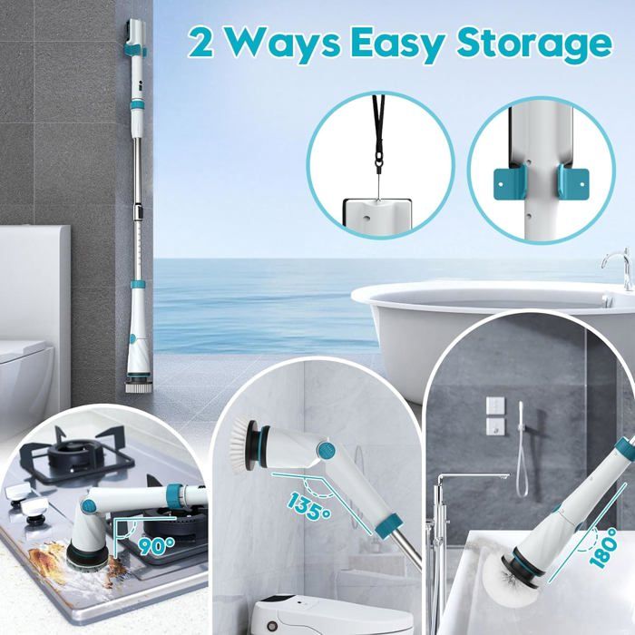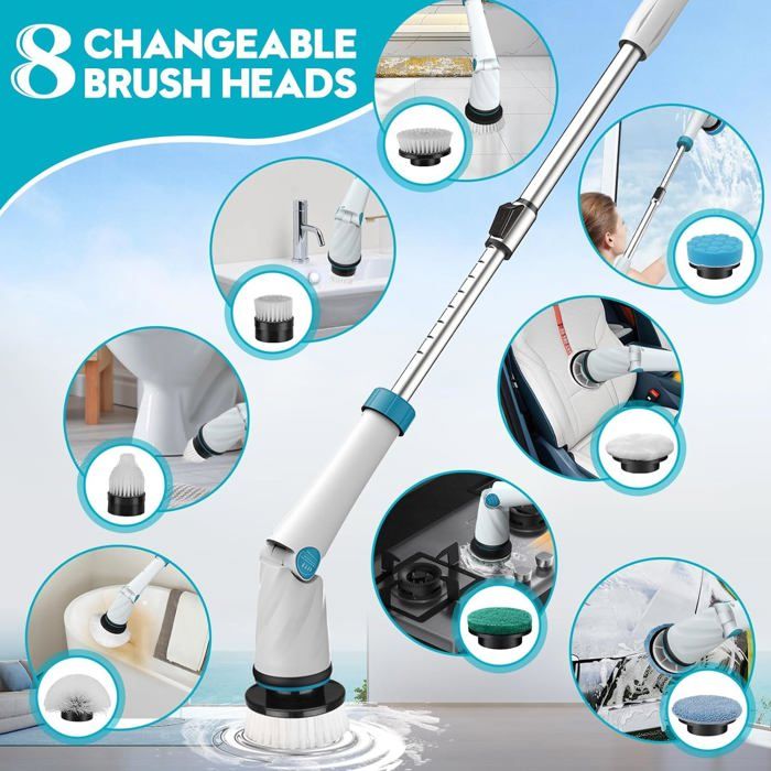 Brosse de nettoyage électrique recharge sans fil avec 8 têtes de brosse remplaçables 60W 2000mAh 3 vitesses Longueur réglable