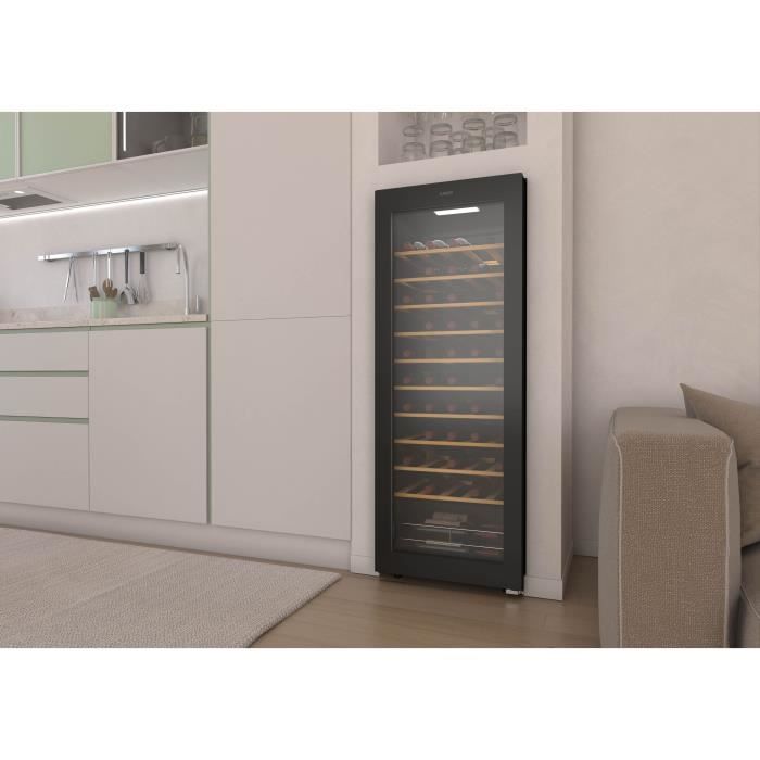 Découvrez la cave à vin de service Candy CWC 058, l’alliée idéale pour les amateurs de vin exigeants. Avec une capacité généreuse de 58 bouteilles et ses 10 clayettes en bois de bambou, elle offre un environnement de conservation optimal, alliant robustesse et élégance. Sa porte vitrée traitée anti-UV à triple épaisseur protège vos précieuses bouteilles des rayons nocifs tout en vous permettant d’admirer votre collection. Grâce à sa connectivité Wi-Fi et l’application hOn, gérez votre cave à distance, créez votre inventaire et laissez-vous inspirer par des suggestions personnalisées. Son éclairage LED sans émission de chaleur garantit une visibilité parfaite sans compromettre la qualité de vos vins. Avec une interface électronique intuitive, une porte réversible pour une installation flexible, et un fonctionnement silencieux à seulement 37 dB, cette cave à vin posable combine performance et confort. Son design noir raffiné s’intègre parfaitement à tous les intérieurs. Offrez à vos vins les meilleures conditions de conservation, entre 5°C et 20°C, grâce à son froid statique et sa classe climatique ST. Un produit pensé pour les passionnés, signé Candy.
