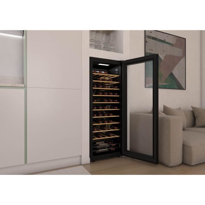 Capacité 58 bouteilles. Classe G. 37 dB. 1 zone. Froid statique. Interface de contrôle électronique. 10 clayettes fixe en bois. Éclairage LED. |