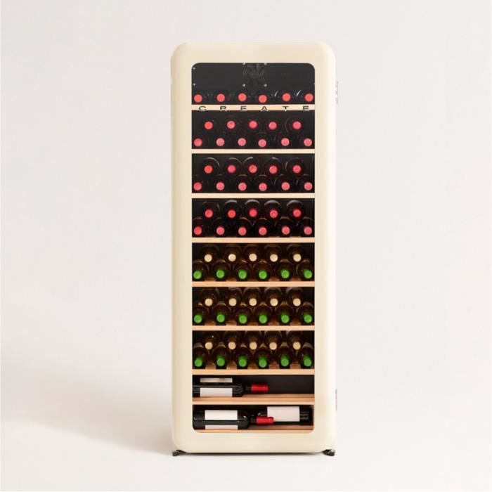 La cave à vin électrique WINECOOLER RETRO de Create est conçue pour stocker vos bouteilles de vin dans des conditions optimales. Disponible en trois capacités, elle peut accueillir 12, 45 ou 76 bouteilles, selon le type d’étagères choisi. La cave offre un contrôle de température numérique réglable entre 4°C et 22°C, permettant de maintenir une humidité et une luminosité idéales pour la conservation du vin. Son design rétro est complété par des finitions lisses et arrondies, et elle est équipée d’un système anti-vibrations et d’un éclairage intérieur LED basse consommation, qui n’émet aucun spectre de lumière bleue pour éviter l’altération des pigments et des tanins du vin. Le corps de la cave est fabriqué en acier inoxydable, garantissant durabilité et résistance. Eco-responsable, elle utilise le réfrigérant isobutane R600a, sans impact sur l’environnement et sans danger pour la couche d’ozone. Les étagères sont en bois de hêtre naturel, et la cave est conçue pour des bouteilles de 75 cl, telles que bordelaise, bourguignonne, de Jerez, champenoise et de Cava, ne dépassant pas 30 cm de hauteur. Notez qu’elle n’est pas adaptée aux bouteilles de type vin du Rhin de 75 cl.