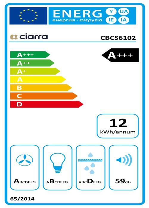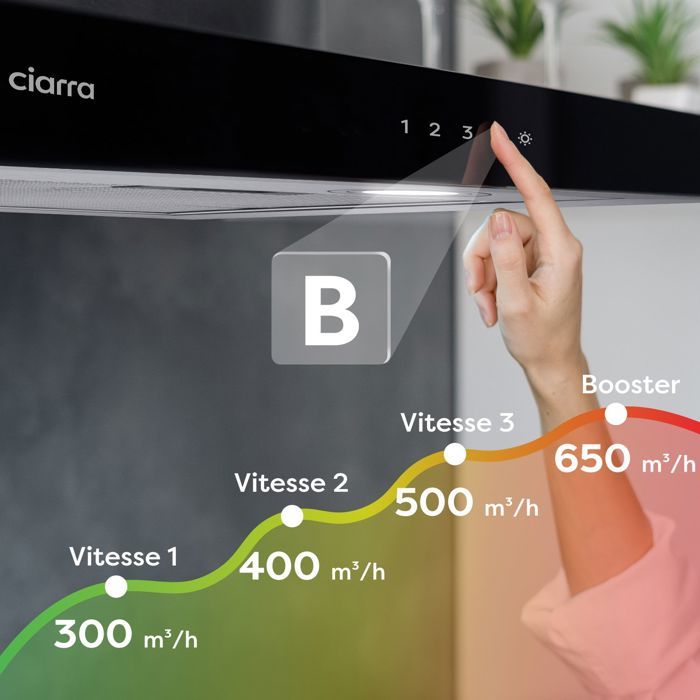 | Nom du produit | CIARRA Hotte Aspirante 60cm Wi-Fi Connecté Classe A+++ 650 m3/h 4 Vitesses Booster Hotte de cuisine Tactile Inox |