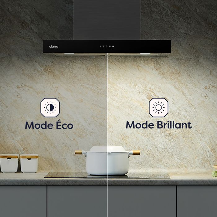 CIARRA CBCS6102, hotte aspirante de 60 cm de largeur, avec panneau des commandes tactiles sensitives, qui vous permet d’accéder facilement au panneau LED pour sélectionner des vitesses. Elle fonctionne à très faible bruit même à la vitesse la plus rapide, afin que vous puissiez profiter d’une expérience de cuisson silencieuse.