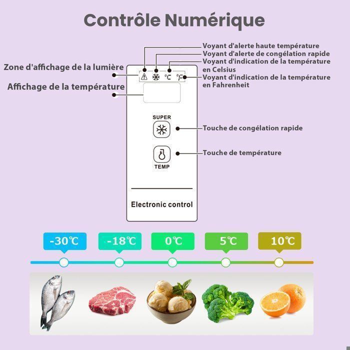 – Ce refrigerateur 1 porte ecologique d’énergieet, économique de classe énergétique E ,fonctionne silencieusement. – Capacité total:99L pour les pizzas surgelées, les frites, les crèmes glacées et bien plus; Dimensions L*L*H: 545 * 495 * 850mm.Poids:24kg – La température de ce réfrigérateur est contrôlée numériquement et il dispose d’un affichage numérique de la température. – ce congélateur coffre a une removable storage basket intérieur.Vous pouvez au besoin retirer ou mettre de l’ordre dans votre congélateur. – Son design épuré et sa couleur blanc en font un accessoire discret et sobre qui s’adaptera à n’importe quel style d’environnement.Idéal pour placer sous une table ou plan de travail. – Nous vous permet de proposer une garantie de 2 ans sur le produit et service client en ligne 24h / 24.