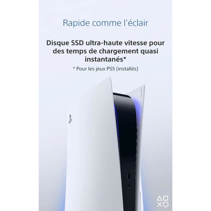 Capacité de stockage de 825 GoGardez vos jeux préférés à portée de main et lancez-les en un instant grâce au SSD intégré de 825 Go.***SSD ultra haute vitesseOptimisez vos sessions de jeu avec des temps de chargement quasi instantanés pour les jeux PS5™ installés.Connectivité intégréeGrâce à l’intégration personnalisée des systèmes de la console PS5™, les développeurs peuvent extraire les données du SSD si rapidement qu’ils peuvent créer des jeux de manière inédite.Ray TracingPlongez dans des univers offrant un niveau de réalisme inégalé, chaque rayon de lumière étant simulé de manière individuelle pour créer des effets d’ombre et de reflets ultra réalistes sur les jeux PS5™ compatibles.Expérience de jeu sur téléviseur 4KDécouvrez vos jeux PS5™ préférés sur votre superbe téléviseur 4K.Jusqu’à 120 images par seconde avec une sortie de 120 HzProfitez d’un gameplay d’une fluidité exceptionnelle grâce à une fréquence d’images pouvant atteindre 120 images par seconde pour les jeux compatibles, avec prise en charge de la sortie 120 Hz sur les écrans 4K.Technologie HDRSur un téléviseur HDR, les jeux PS5™ compatibles dévoilent une palette de couleurs éclatantes et d’un réalisme saisissant.Technologie audio Tempest 3D Audio TechImmergez-vous dans des environnements sonores où le son semble émaner de toutes les directions. Que vous utilisiez un casque ou les haut-parleurs de votre téléviseur, votre univers prend vie grâce à la technologie audio Tempest 3D Audio Tech*** sur les jeux compatibles.Retour haptiqueVivez l’expérience du retour haptique à travers la manette sans fil DualSense™ en plongeant dans une sélection de jeux PS5™. Ressentez les effets et l’impact de vos actions en jeu grâce à un retour sensoriel dynamique.Gâchettes adaptativesMaîtrisez les gâchettes adaptatives immersives et leurs niveaux de résistance dynamique, reproduisant l’impact physique de vos actions en jeu dans divers titres PS5™.Rétrocompatibilité et mode Game BoostLa console PS5® prend en charge plus de 4 000 jeux PS4®. Grâce à la fonctionnalité Game Boost, vous pouvez même profiter d’un taux de rafraîchissement amélioré dans certains des meilleurs jeux de la console PS4.