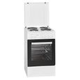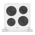 Cuisinière électrique avec plaque de masse de largeur 50 cm. 4 zones de cuisson avec 4 interrupteurs de réglage : 2*14.5 cm 1.000 W, 1*18.0 cm 1.500 W, 1*18.0 cm 2.000 W (plaque rapide). Four électrique de 48 litres de classe A avec chaleur inférieure (1.000 W), chaleur supérieure (800 W) et chaleur supérieure/inférieure.