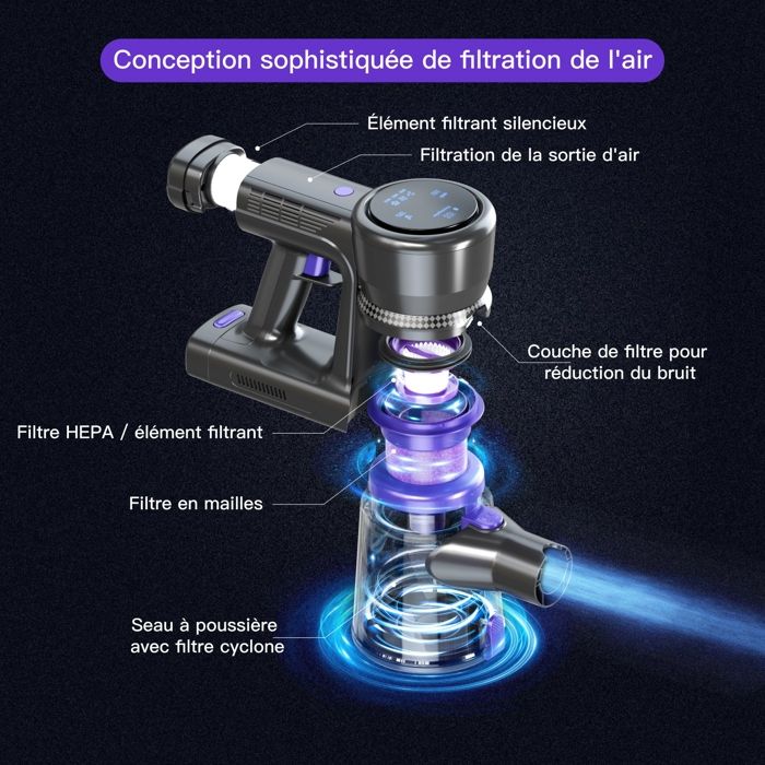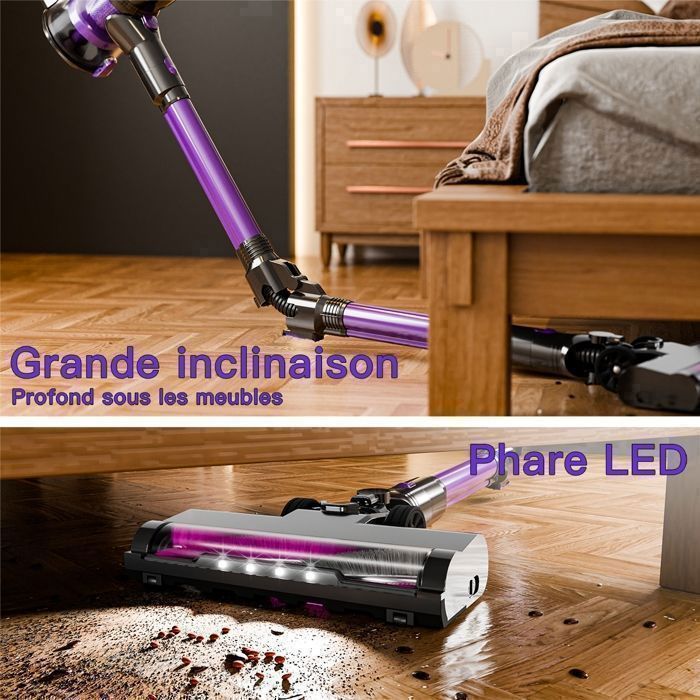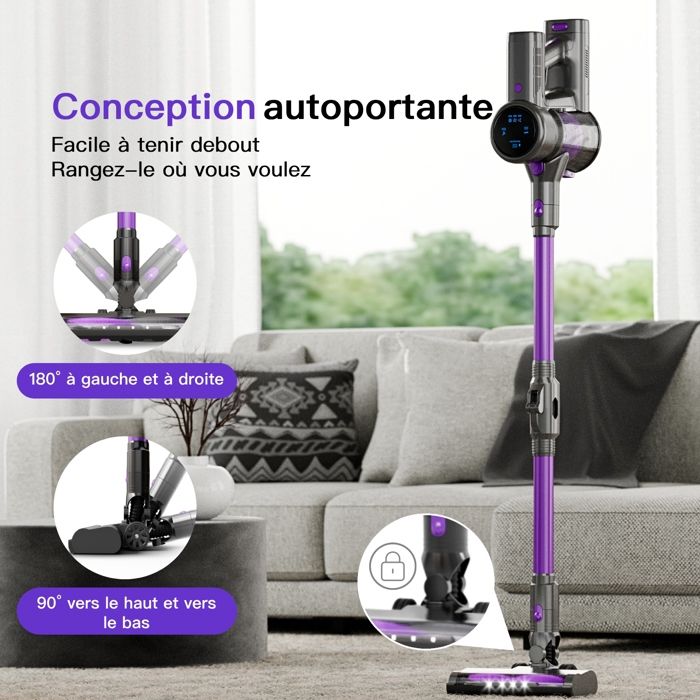 | Fonctions spéciales | Baguette pliable pour le nettoyage sous les meubles, buse de sol éclairée et motorisée, légère, rangement autonome, mode portable polyvalent |