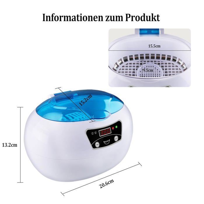 - 🛡️ Cuve en acier inoxydable de 600 ml : Robuste, anticorrosion et résistante à la rouille, elle offre suffisamment d’espace pour accueillir plusieurs objets à la fois. Une grille intérieure amovible et un support permettent aussi de nettoyer les articles les plus fragiles.