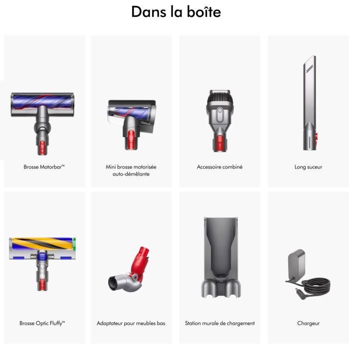 | Outils inclus | Brosse Optic Fluffy, Brosse Motorbar, Accessoire combiné, Mini brosse motorisée auto-démêlante, Clip de rangement des accessoires sur le tube, Long suceur, Adaptateur pour meubles bas, Station murale de chargement, Chargeur |