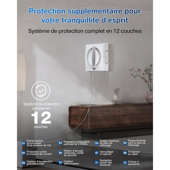 - 【Système de protection à 12 niveaux】Avec le système de protection à 12 niveaux, basé sur le matériel et le logiciel, WINBOT W2 PRO OMNI offre une sécurité maximale pour le nettoyage des fenêtres et leur hygiène. L’ensemble du système de protection comprend 8 mesures de protection basées sur le matériel contre les chutes, 3 étapes de protection intelligente et une assurance contre les dommages accidentels.