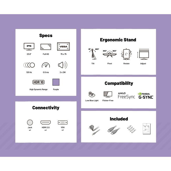 | Nom du produit | Ecran PC Gamer – JAPANNEXT – 23.8″ – IPS – Full HD (1920×1080) – 120Hz – 0.5ms – Violet Pastel – JN-IPS238G120F-HSP-PP |