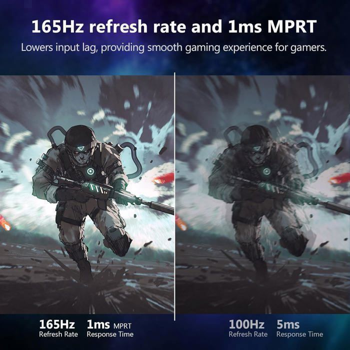 165Hz & 1ms MPRT : ce moniteur est né pour les jeux. Offrez une expérience de jeu fluide avec un temps de réponse de 1ms et un taux de rafraîchissement de 165Hz. Adpitive FreeSync intégré élimine pratiquement la déchirure de l’écran, le baguettement et la latence d’entrée. Les modes FPS, RTS et crosshairs vous offrent une expérience de jeu exceptionnelle.
