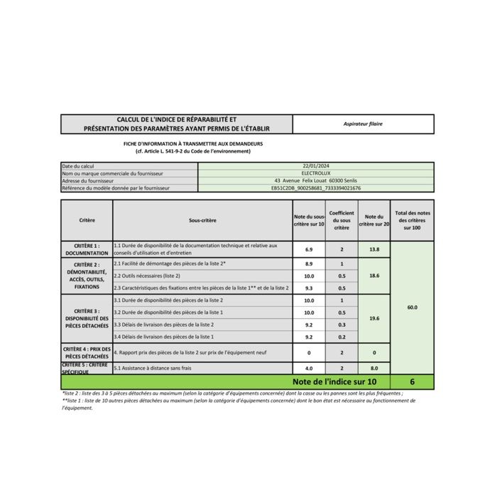 Indice de réparabilité : 6.