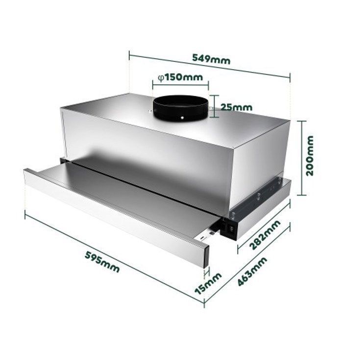 Description du produit:FIREGAS hotte tiroir téléscopique 60 cm, 350 m³ / h, recirculation ou évacuation, 2 vitesses, avec filtre à charbon