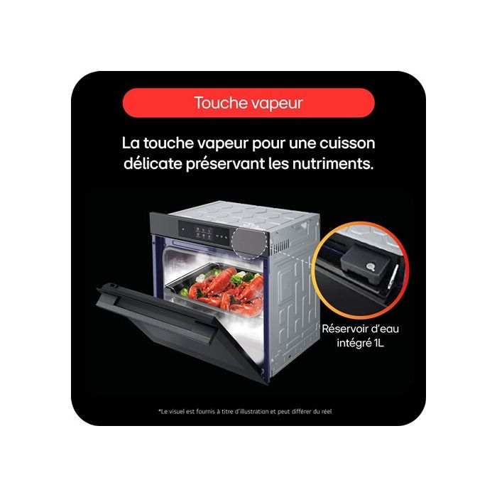Ce four est équipé d’un générateur de vapeur et d’un réservoir d’eau d’un litre. La technologie LG Steam™ diffuse chaleur et humidité de manière homogène, préservant ainsi la texture et les nutriments des aliments.Grande capacité