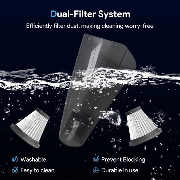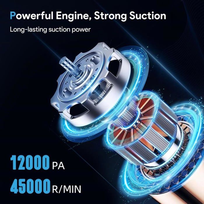 ASPIRATION MAXIMALE, EFFORT MINIMAL — Faites l’expérience d’un nettoyage en profondeur sans effort grâce à la puissante aspiration de 12 000 Pa de cet aspirateur portable. Parfait pour les maisons et les bureaux, il élimine efficacement la poussière, les miettes et les poils d’animaux des tapis et des sols durs, garantissant un environnement impeccable grâce à son moteur robuste et à sa batterie longue durée.FILTRE HEPA ÉTANCHE NOUVELLEMENT AMÉLIORÉ — Profitez d’une lavabilité illimitée sans perte d’aspiration. Contrairement à d’autres, notre filtre HEPA, fabriqué à partir d’un matériau PET innovant à haute teneur en polymère, conserve ses performances après le lavage.ÉCLAIRAGE LED LUMINEUX, AUCUN POINT MANQUÉ — Illuminez les coins et espaces sombres sous les meubles grâce à notre conception d’éclairage LED unique. Repérez facilement la poussière et les débris cachés, garantissant une couverture de nettoyage complète sans manquer aucun endroit.LÉGER, 650 G ET SANS FIL — Avec un poids de seulement 650 g, cet aspirateur sans fil ultra-léger est facile à utiliser pour tous, y compris les femmes et les enfants. Sa portabilité permet une utilisation et un transport pratiques, rendant les tâches de nettoyage simples et sans tracas où que vous alliez.OUTILS DE NETTOYAGE AMÉLIORÉS — Cet aspirateur portatif sans fil est doté de deux accessoires essentiels pour un nettoyage en profondeur. La brosse élimine efficacement les poils et la poussière des tissus d’ameublement, tandis que l’outil pour crevasses est parfait pour un nettoyage en profondeur dans les espaces restreints et les coins.