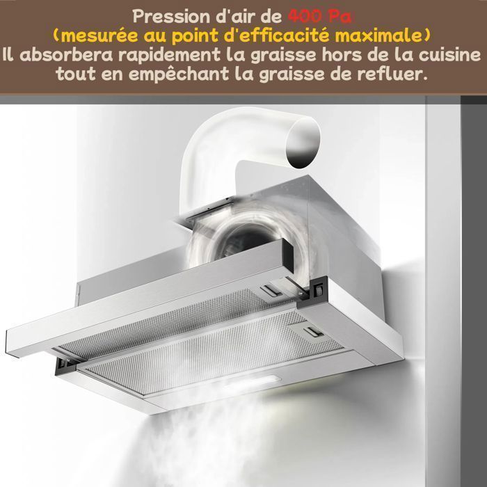 KICHPOWER Hotte Tiroir Téléscopique, Hotte Aspirante 60cm, 620 m³/h, Hotte Aspirante intégrée, Surface inox