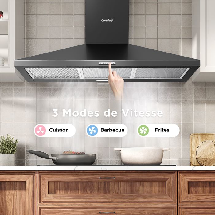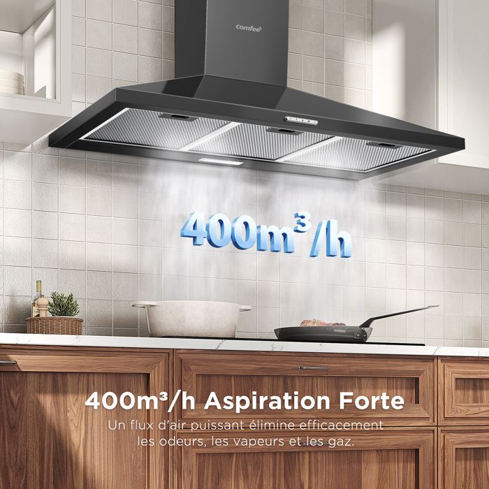 Hotte Aspirante Comfee Hotte de Cuisine 90cm – 400 m³/h – 2 Filtres à Charbon – 3 Vitesses-Recyclage ou Évacuation – LED – NOIR