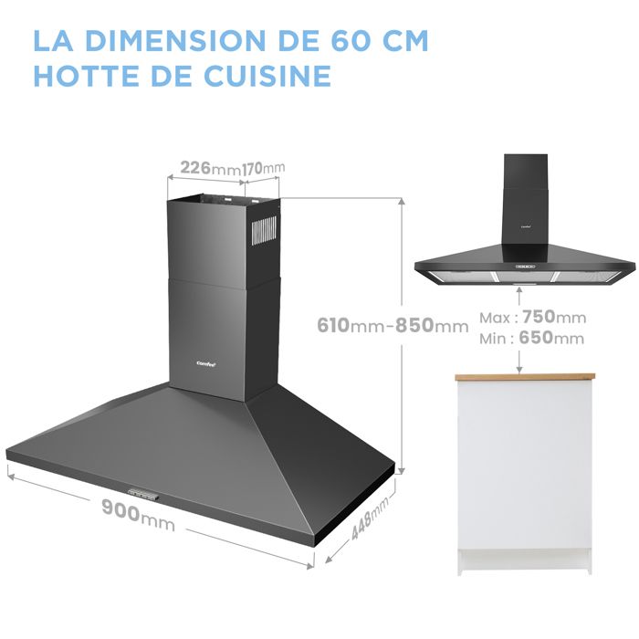 | Nom du produit | Hotte Aspirante Comfee Hotte de Cuisine 90cm – 400 m³/h – 2 Filtres à Charbon – 3 Vitesses-Recyclage ou Évacuation – LED – NOIR |