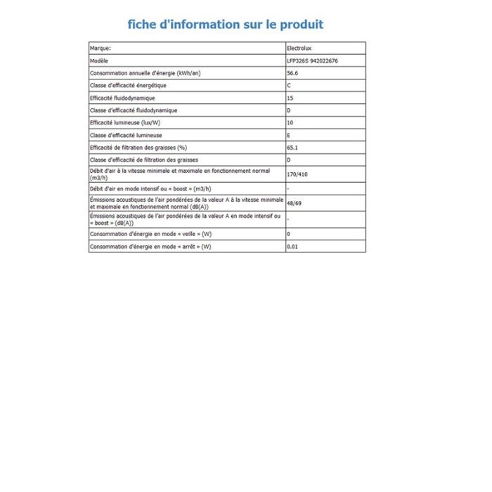 Hotte tiroir Electrolux LFP326SCaracteristiques principales : Pays de fabrication : Pologne.Origine de fabrication : Fabriqué en Europe.Classe énergétique : C.Fonctionnalités de la hotte : Fonction recyclage de l’air.Type d’aspiration : Evacuation.Connecté : Non.Diamètre de sortie d’air : 15 cm.Eclairage : par LED : 2 – Puissance totale 8 W.Nombre de vitesses : 3.Filtre hotte : filtre à charbon standard ECFB03ST.Avantages produits : . Fonctionne en évacuation ou en recyclage avec filtre charbon en option.Garantie d’origine : 2 ans.Couleur : Gris.Hauteur : 18 cm.Profondeur : 31 cm.Largeur : 60 cm.Niveau sonore : 69 dB.Disponibilité des pièces détachées : 15 ans.Caracteristiques principales :
