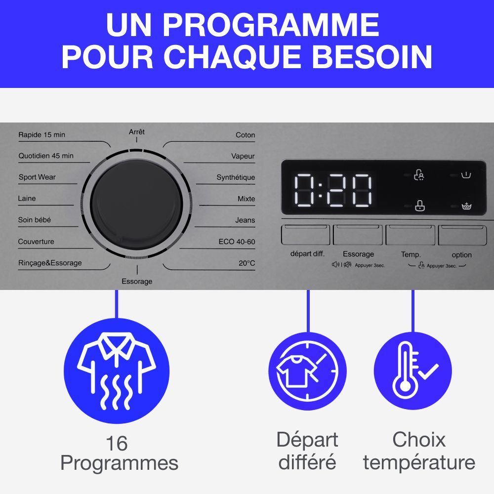Les différents programmes proposés sur votre équipement vous permettent de vous adapter à vos différents textiles : linge de maison, délicat, coton, synthétique…Ce lave linge vous permet également de procéder à un lavage rapide et au lavage a froid. Le programme de 15 min est id��al pour une petite quantité de linge peu sale. Econome et rapide cela convient parfaitement pour les personnes pressées ou pour simplement enlever les mauvaises odeurs des textiles.