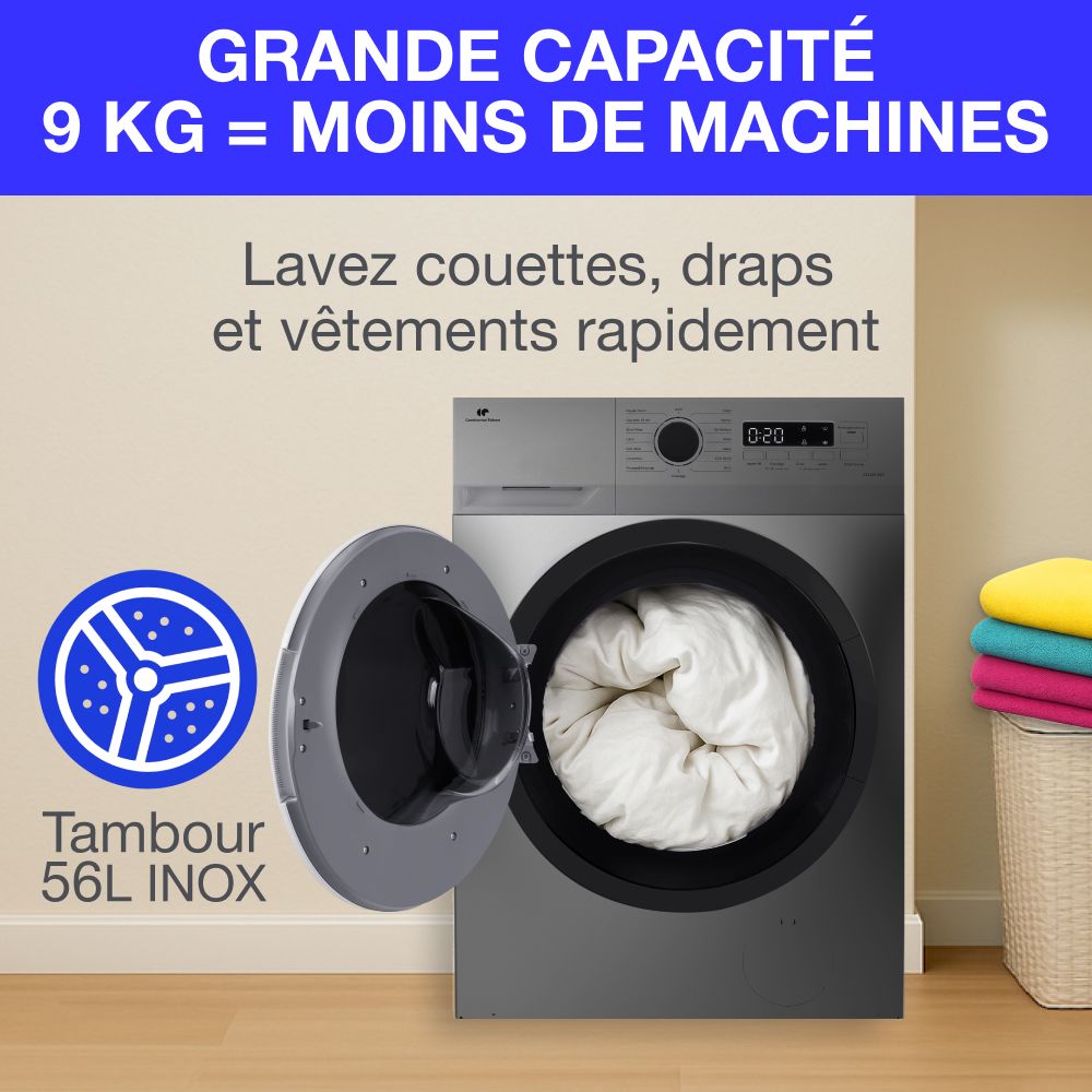 | Nom du produit | Lave-linge hublot CONTINENTAL EDISON CELL914ISS – 9 kg – Largeur 59,5 cm – Classe A – 1400 trs – moteur induction -Silver |