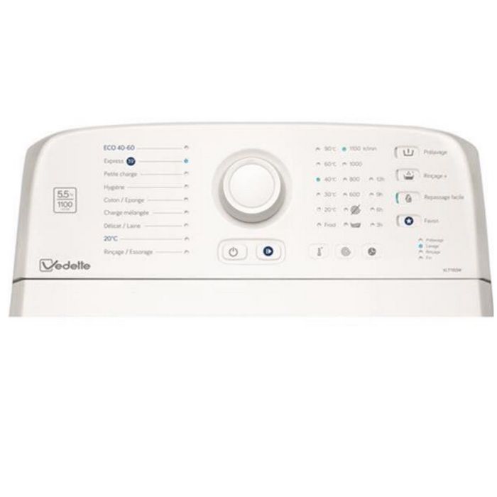 Le lave-linge top VEDETTE VLT1155W offre 9 programmes, dont Délicat/Laine et Express 39 min. Il élimine 99,9% des bactéries grâce à un lavage à 60°C. Idéal pour un lavage rapide et efficace.